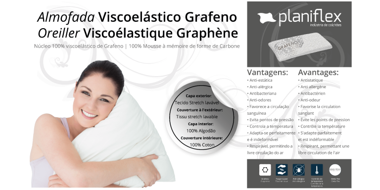 A almofada Visco Grafeno está fabricada com um núcleo viscoelástico e partículas de material grafénico. Possui múltiplas qualidades destacando a sua alta resistência e leveza. Pesa cinco vezes menos que o aço e é duzentas vezes mais resistente.