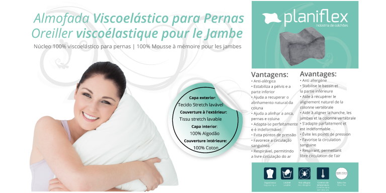 A almofada entre pernas está fabricada com uma lâmina contínua de viscoelástica 100%. Graças à sua flexibilidade, a espuma ajusta-se ao contorno corporal proporcionando uma postura melhor para um descanso comodou e correto.