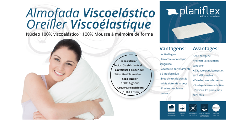 A almofada Visco está fabricada com uma lâmina contínua de viscoelástica 100%. Graças à sua flexibilidade, a espuma ajusta-se ao contorno corporal proporcionando uma perfeita adaptação ao pescoço e do pescoço.